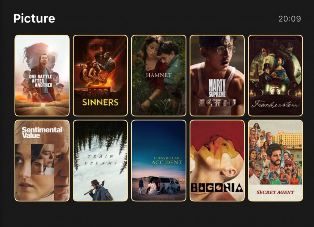 The likely film lineup is: One Battle After Another, Hamnet, Sinners,Frankenstein, Marty Supreme, Sentimental Value, The Secret Agent, It was Just an Accident, Bugonia, Train Dreams.