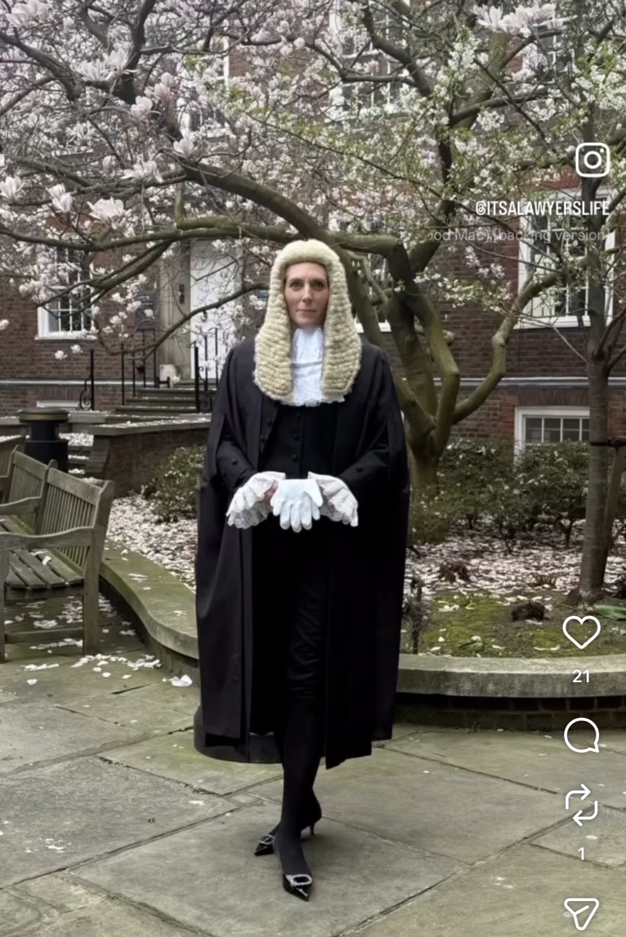 They wear a silk black silk gown and a fully bottomed wig. Around the neck a wing collar with bands (two strips of fabric) is worn. Under the silk gown the men wear a formal black coat and waistcoat with black trousers and the women wear a black skirt. The black buckled shoes are especially cute, although I was told, not particularly comfortable.